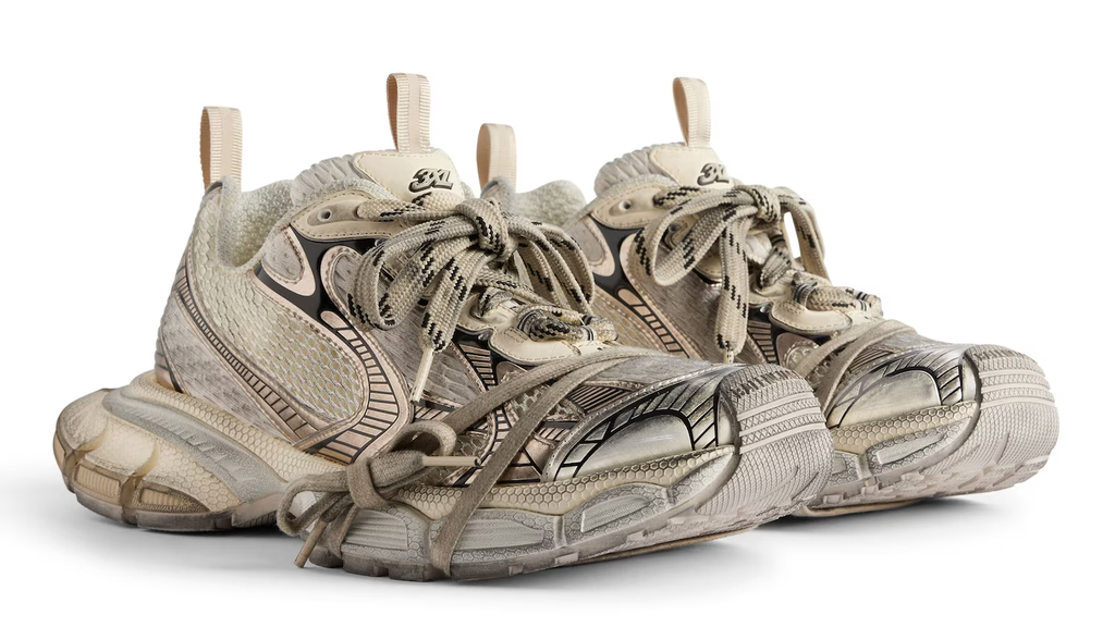 Забудьте о стандартах. Это не просто кроссовки — это артефакт будущего, найденный в прошлом. Balenciaga 3XL Worn-Out Ivory Metallic Old — дерзкий манифест в мире уличной моды, где каждая потертость рассказывает историю, а каждый элемент претендует на культовый статус.